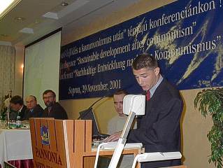 Czizmadia Norbert titkárságvezető Dr. Tardy János a Környezetvédelmi Minisztérium helyettes államtitkára a fenntartható természetvédelem fő kérdéseit ismertette. A témakörhöz kapcsolódóan kiemelte a regionalitás fontosságát a Pannon-tartomány, mint biogeológiai környezet esetében. A környezetvédelem fontossága elsősorban a határokon átnyúló védett területek kialakításának szükségességében jelentkezik- hangsúlyozta az előadó. A geopolitikai helyzetből adódó sérülékenység elleni politikai vagy katonai védelem lehetetlenségéről szólva, a Kőszegi Natúrparkot, az Őrségi Tájvédelmi Körzetet, vagy a Fertő-Hansági Nemzeti Parkot követendő és folytatandó példákként említette. A tulajdonosi struktúrák átalakulásával kapcsolatban szólt a természetvédelem és az agrárium összefüggéseiről, példákkal is igazolva, hogy az EU tagországoknak is türelmi időre állt rendelkezésükre, ahhoz, hogy az EU-s jogszabályoknak megfeleljenek.