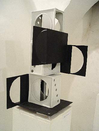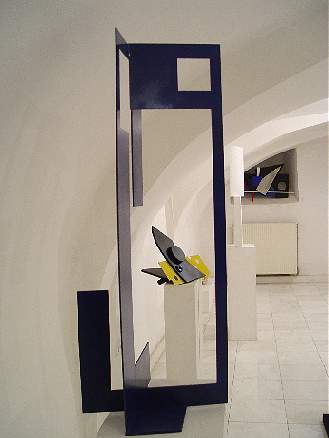 A pincehelyiségben Ézsiás István szobrászművész relief-jei, térelemei, hommage-ai, tükörképei, vertikális és horizontális térformái láthatók.