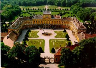 alapján épült fel a hatalmas kastélyegyüttes; a tőle délre eső monumentális