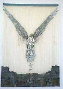 formátumában talált tárgyak, kiegészítő anyagok szervesülnek textilművé.
