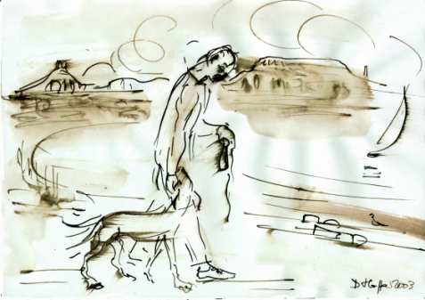 A szoros póráz két ellenfelet köt össze: a gazda birkózik a kutyussal, az húzza-taszigálja őt, mindkét fél liheg. Mindig éppen az erősebb célja felé, ezért kiszámíthatatlan út- és nyomvonalon haladnak. Ha véletlenül leoldódik a szíj, két eset lehetséges: vagy nekiiramodik a kutya a rég vágyott cél irányában, visszatarthatatlanul, vagy éppen tanácstalanul és gyámoltalanul megáll, mert az erős ellentartás nélkül immár nincs értelme az egésznek.
